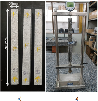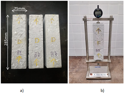 Figura 5 a) realización del ensayo SDT en el Laboratorio de Materiales y Estructuras de la Universidad Federal de Paraná (LaME-UFPR); b) comportamiento tensión-deformación para muestras de hormigón afectadas por RAA (Sanchez et al., 2017).
