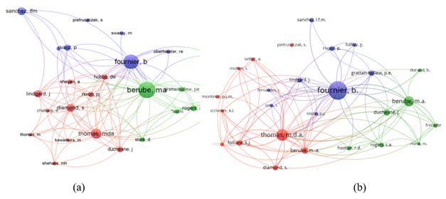Analizando las Figuras 2(a) y 2(b), se pueden observar tres grandes temas de investigación liderados por Fournier, Thomas y Berubè con 29, 21 y 14 publicaciones de cada autor, respectivamente, en las bases de datos WoS y para Scopus, excluyendo los trabajos repetidos.