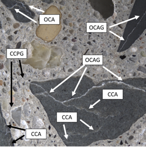 Grupo I: fisuras cerradas (abertura ≤ 0,1 mm) en partículas de árido grueso o en la fracción gruesa de partículas de arena (1 a 5 mm) (CCA);