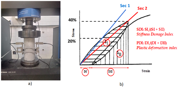 Los números SDT expresan las características mecánicas del hormigón, es decir, a medida que las expansiones provocadas por la RAA avanzan, también aumentan las fisuras, disminuyendo su módulo de elasticidad y resistencia a la tracción (Sanchez et al., 2017). La Figura 5(a) muestra el ensayo SDT siendo realizando en el LaME-UFPR, mientras que la Figura 5b muestra un resultado de salida del propio SDT, donde se identifican los parámetros denominados Stiffness Damage Index (SDI) e Stiffness Damage Index, los cuales se traducen como la relación entre la energía disipada y la energía total aplicada a la muestra, así como la relación entre la deformación plástica y la deformación total aplicada al sistema, respectivamente. Finalmente, el módulo de elasticidad así como el índice no lineal (NLI) también se pueden obtener de la prueba.