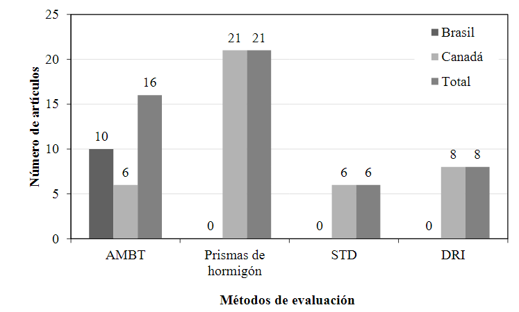 La mayoría de los trabajos (13 artículos) están relacionados con metodologías para evaluar el daño causado por reacciones álcali-árido. Esto se refiere a los intentos de estandarizar las pruebas utilizadas a nivel mundial y la correlación entre los métodos acelerados y de campo (Lindgard et al., 2016). Además, la mayoría de estas investigaciones fueron dirigidas por el grupo de investigación canadiense de Fournier, con importantes contribuciones del brasileño Sánchez, profesor de la Universidad de Ottawa.