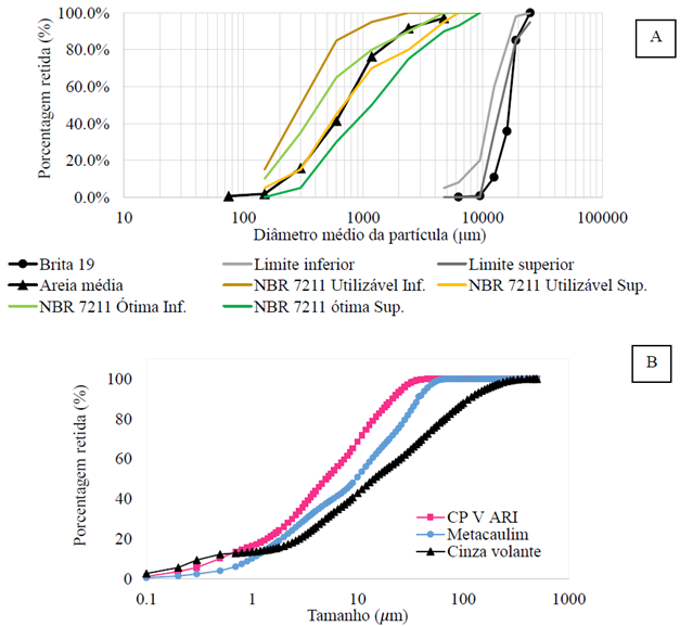 Figura 3 Distribuição granulométrica dos agregados (A) e cimento e adições (B)