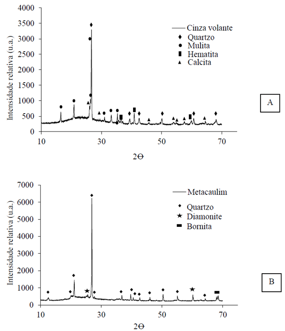 Na Figura 4 (A), observam-se os picos cristalinos de Quartzo, Mulita, Hematita e Calcita, com um halo amorfo entre 15° e 30° indicando haver certa quantidade de materiais reativos. Na Figura 4(B), foram identificados picos de Quartzo, Bornita e Diamonite, com um halo amorfo discreto entre 20° e 30°. Embora o MK tenha apresentado halo amorfo menor do que a CV, conforme ensaio da norma brasileira NBR 5751 (ABNT, 2015), a atividade pozolânica do MK foi significativamente superior à da CV. Segundo a norma NBR 12653 (ABNT, 2015) o material é considerado pozolânico quando o somatório dos óxidos de silício, alumínio e ferro é maior ou igual a 70%. De acordo com os dados apresentados na Tabela 3 o resultado desse somatório foi de 89,41 % para cinza volante e 95,31% para o metacaulim. Esse aspecto, aliado à menor finura do MK, é uma explicação para o resultado da pozolanicidade do MK ter sido superior a CV.