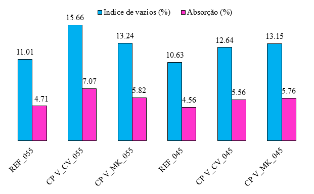 Na Figura 7 são apresentados os valores médios de 2 CP para o ensaio de absorção total por imersão de água e índice de vazios obtidos pelo ensaio descrito na norma NBR 9778 (ABNT, 2005). Segundo essa norma, o índice de vazios é a relação entre o volume de poros permeáveis e o volume total da amostra. Para tal, é esperado que, quanto maior o índice de vazios, maior a capacidade de absorção da amostra.
