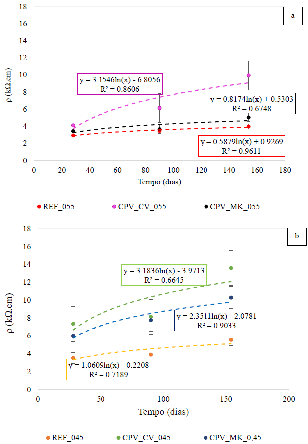 Os resultados do ensaio de resistividade para os concretos estudados ao longo do tempo são apresentados na Figura 8. Esses resultados são uma média de 3 CP, com 18 medições no total.