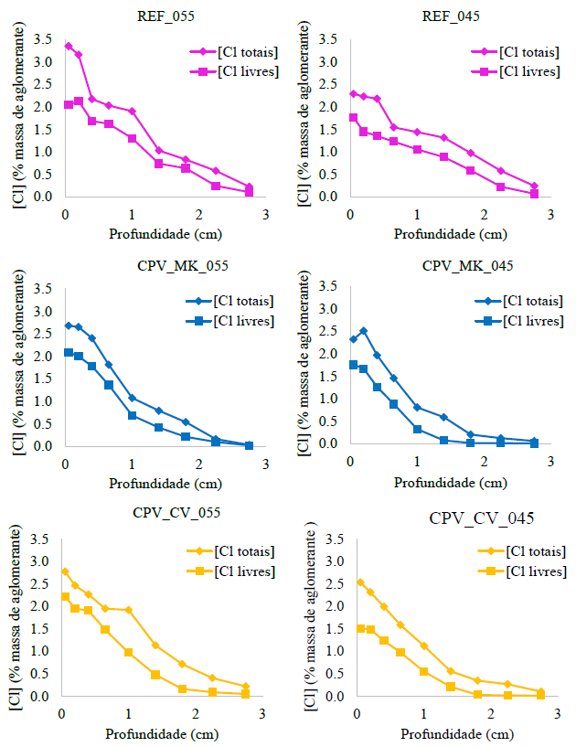 Na Figura 9, são apresentados os resultados obtidos para os perfis de cloretos livres e totais, para todas as misturas investigadas. Cada perfil apresentado representa a média de resultados obtidos para 3 CPs.