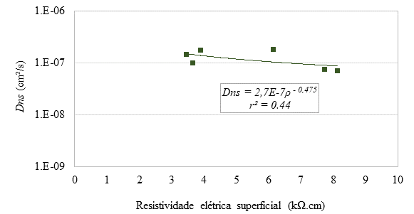 Embora os ensaios de difusão tenham sido empregados com regularidade para avaliar a resistência à penetração de cloretos de matrizes cimentícias há algum tempo na Europa, América do Norte e outras regiões, no Brasil, esses ensaios ainda não são empregados com regularidade. Por outro lado, o tempo demandado na realização desses ensaios fez com que alternativas fossem buscadas nos últimos anos. Nesse contexto, se insere o ensaio de resistividade elétrica superficial, que é um ensaio de aplicação instantânea e tem boa relação com o ensaio de difusão de íons cloreto. Esse tipo de aplicação do ensaio de resistividade elétrica superficial pode ser observado de forma mais presente na última década nos trabalhos publicados pela pesquisadora Carmen Andrade (Andrade, 2018; Andrade et al., 2014; Andrade e D’Andrea, 2011). A Figura 2, exemplifica a boa relação entre o ensaio de resistividade elétrica superficial e a difusividade de íons cloreto.
