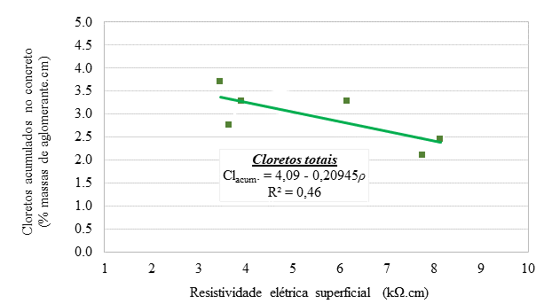 Observa-se, na Figura 10, que o coeficiente de determinação é relativamente baixo, o que pode ser atribuído às diferenças entre dosagens e suas capacidades de fixação de cloretos, bem como ao fato de que a diferença de resistividade entre os concretos é bem menor que aquela apresentada na Figura 3. Uma outra maneira de abordar a relação entre o transporte de cloretos e a resistividade é através da relação entre o total de cloretos acumulados no concreto e a resistividade. Isso pode ser visto na Figura 11, que mostra uma relação linear entre essas duas variáveis.