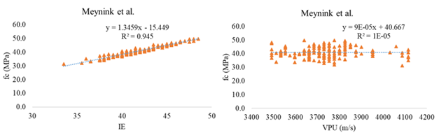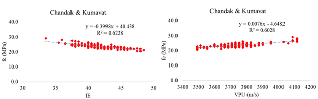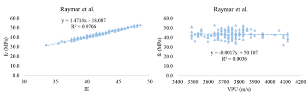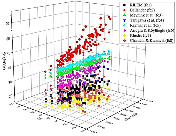 A análise do comportamento das variáveis IE e VPU em relação ao fc calculado mostra que nos modelos em que existe uma correlação coerente para ambos os pares de variáveis (IE vs fc, VPU vs fc) (Figuras 6, 9), o fc calculado tende a se aproximar do valor de referência. Para os casos dos modelos propostos por Bellander, Meynink et al., Raymar et al. e Kheder (Figuras 7, 8, 10, 12 respetivamente), embora apresentem uma correlação muito boa entre IE vs fc, no que diz respeito ao VPU não parece haver influência desta variável em fc, pelo que o resultado obtido difere. longe do valor de referência de 27,0 MPa. Talvez seja por isso que as diferenças em relação à referência foram superiores a 20% para todos os casos. Um resultado interessante foi obtido a partir do modelo Chandak & Kumavat (Figura 13), onde as relações IE e VPU são opostas em relação a fc. O fato do erro obtido ser inferior a 15% pode estar associado ao fato de que, embora as correlações sejam contrárias, existe uma tendência linear do IE e do VPU na fc calculada.