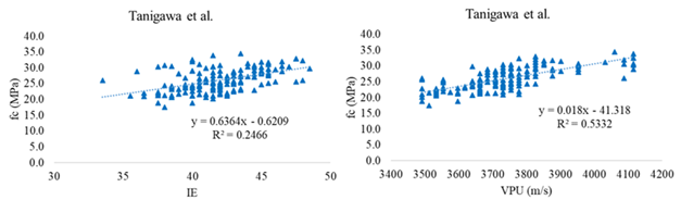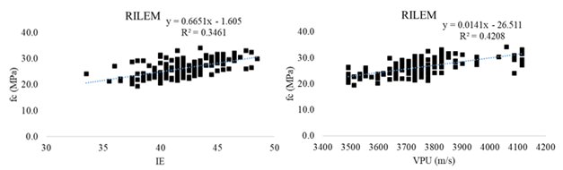Os resultados são apresentados na Tabela 8. No cálculo da fc dos modelos propostos (Tabela 9), observa-se uma maior dispersão no CV dos resultados, o que se deve ao desenho de cada equação. Com base nos resultados obtidos, os modelos com melhor aproximação do valor de referência são RILEM e Tanigawa et al. com 26,29 MPa e 26,07 MPa respectivamente (Figura 3), com erro inferior a 4% para ambos os casos (Figura 4). A Figura 5 mostra como alguns modelos apresentam um comportamento linear, enquanto outros refletem uma maior dispersão nos resultados. Essa variabilidade é determinada pelo desenho de cada equação (linear, polinomial e de potência) para a estimativa do fc, que fica dependente dos valores de IE e VPU obtidos.