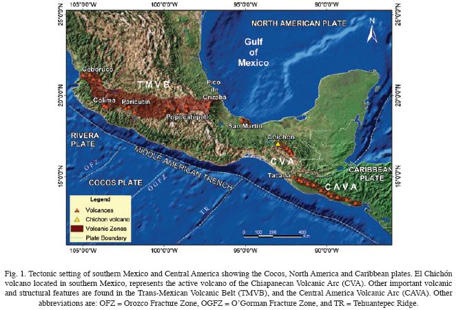 El Chichón volcano (N17°21'30", W93°13'48"; 1,100 m above sea level) is located in the northwestern area of the Chiapas State in southern Mexico. El Chichón represents the northwesternmost active volcano of the Chiapanecan Volcanic Arc (CVA) (Damon and Montesinos, 1978), formed by the subduction of the Cocos plate beneath the North American plate, at the Middle American Trench (Stoiber and Carr, 1973) (Fig. 1). El Chichón volcano is built upon a late Jurassicearly Cretaceous marine sequence and Tertiary sedimentary rocks (Canul and Rocha, 1981; Duffield et al., 1984). On top of these sedimentary rocks were extruded a 1.1 Ma trachybasalt, whose outcrops are located in the vicinity of Chapul tenango (GarcíaPalomo et al., 2004). The initial phases of volcanism at El Chichón began around 0.37 Ma ago (Layer et al., this issue), followed by the formation of the Somma crater some 0.210.27 Ma (Damon and Montesinos, 1978; Duffield et al., 1984) and the extrusion of peripheral domes 0.22 and 0.09 Ma and Holocene activity (Layer et al., this issue).