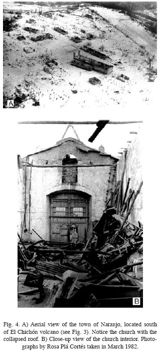 Pyroclastic surges and flows reached as far as 10 km from the crater, affecting an approximated area of 100 km2, where everything was completely flattened and barren (Fig. 3AB). Beyond this zone, another zone covering some 150 km2 was affected by falling ash, which caused roofs of buildings to collapse (Figs. 3C, and 4AB). Collectively, these two zones included 35,433 hectares and 29,321 of them were severely damaged. Within the area affected by the eruption lived ca.approximately 6,000 people (INEGI, 1997), of whom about 2,000 were killed by the eruption. Water supplies in both zones were polluted and most animals perished (BáezJorge et al., 1985). The villages that were completely or partially destroyed within the two zones were: Volcán Chichonal, Esquipula Guayabal, San Pedro Yaspac, Guadalupe Victoria, Carmen Tonapac, and Vicente Guerrero in Chapultenango county; El Naranjo, Volcán, Francisco León, Trinidad, San Antonio, San Isidro Tanchichal, Agua Tibia and San Juan Bosco in Francisco León county (Figs. 3 and 4).