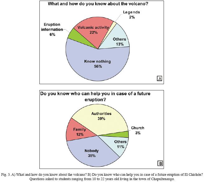All the student respondents were not yet born at the time of the 1982 eruption. The ages of the students range between 10 and 22 years old (14 average), of which 87% are Catholics, 9% are Adventist, and a minority (4%) not practicing any religion. Overall, 38% are bilingual; they speak the local Zoque language as well as Spanish. Some 28% have never visited the summit area of El Chichón volcano, with the lowest percentages among elementary school students. About 30% were aware of the 1982 eruption and its impacts in their surroundings. Among the 70% that did not, 12% knew some other details on the origin of the volcanic activity, 18% mentioned other types of information related to the volcano and its history such as legends, 22% described other subjects not relevant to the eruption, and 18% indicated that they do not know anything related to El Chichón volcano. Not surprisingly, comparing the results among the different education levels it is clear that high school students (44%) know more information about the eruption than do elementary and secondory school students.