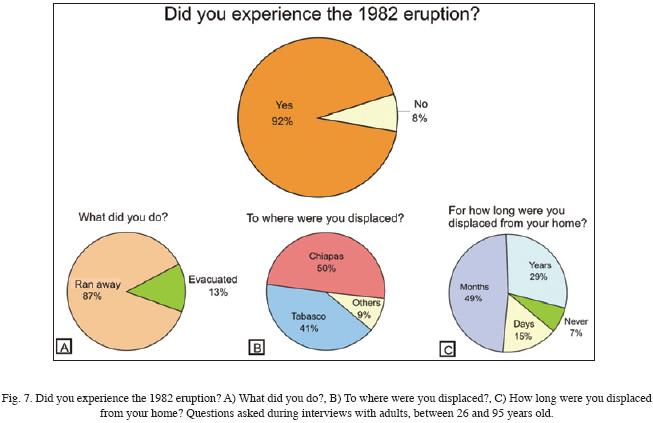 Our study presents the first data obtained from a socialscience study of the community of Chapultenango after the 1982 eruption of El Chichón. One of the most interesting aspects of the survey was to evaluate the volcanic hazards and related phenomena witnessed by the adult group that experienced the eruption. During the March 28, 1982 eruption, this group recognized ash fallout and earthquakes as the main hazards. This observation correlates fairly well with the stratigraphy described for this particular eruption, which emplaced a single fallout layer designated "A" by Sigurdsson et al. (1984). However, it is possible that the adult group at Chapultenango did not recognize other phenomena during the March 28 eruption (i.e., lightning, thunder, and explosions) because the town does not have a direct line of sight to the volcano and also because of the complete chaos that ensued during the eruption in all towns around the volcano. In fact, 87% of the adults were trying to escape by foot to the nearby communities of Ixtacomitán and Pichucalco. During the following day (29 March), 13% of the adults were evacuated by the Army, and most of them never returned to their homes. At the time of the April 3 explosion, which occurred at night and was the most violent event of the 1982 eruption (Yokoyama et al., 1992), most adults were at shelters in the town of Pichucalco. Even though this town is situated 20 km NE of El Chichón, it has a better view of the volcano than that from Chapultenango. Thus, people at Pichucalco, including most of the adults interviewed, were able to witness the 3 April explosion.