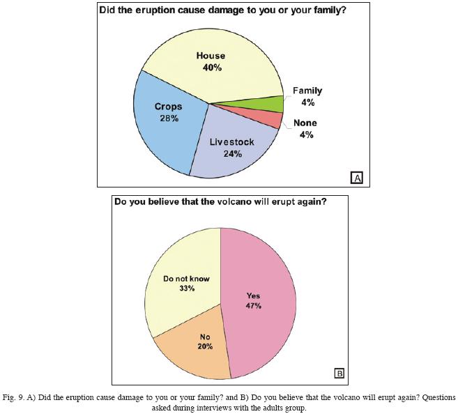 As a group, the students are better informed about the volcano and related activity (82%) than are the adults (43%). About 80% of the students thought that the volcano will erupt again because volcanism is a natural phenomenon, and that the longer it takes to renew its activity, the greater the possibility of another eruption. In contrast, 53% of the adults thought that the volcano will not erupt again, perhaps assuming that volcanoes erupt only once during their entire life span. Some 54% of the students are afraid to live close to the volcano, because they believe that, in a future eruption, they will not have enough time to leave their community before being buried by ash. In contrast, 65% of the adults are conscious that their community will be affected by a future eruption, but they are not afraid because they survived the one in 1982. They now believe they will know what to do and how to react in a future eruption. It appears that their beliefs about what they should do are based more on their prior experience with the 1982 eruption or information that they obtained informally since the eruption; a minority of them (25%) indicated they had been informed about preparedness, emergency plans, and evacuation routes. Students, on the other hand, apparently had received more information than the adults (44%). Thus, it is clear that the adults' thinking reflected experience gained during the 1982 eruption, but that does not necessarily mean that their intentions are what would be desired by authorities. For example, while 91% of the students said they would evacuate the town in a future eruption, only 51% of the adults said they would leave. Perhaps the 49% of the adults who stated that they will not leave their homes in the next eruption reflects their worry that during the 1982 eruption they and others suffered at the shelters and their properties were looted while they were away from their homes.