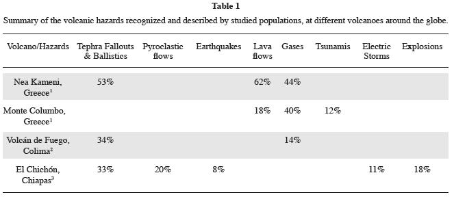Table 1 shows the volcanic hazards that the population of Chapultenango perceive as genuine threats to their community. These hazards, in order of importance as perceived by the people, are: tephra fallout and ballistics (33%), pyroclastic flows (20%), earthquakes (8%), electric storms (11%), and explosions (18%). If we compare the volcanic hazard considered the most dangerous (33 %) at El Chichón (tephra fallout and ballistic projectiles) with other studied cases, we note similar results for Colima volcano (34%). However, both these percentages are lower if they are compared to Nea Kameni, Greece (53%) (DomineyHowes and MinosMinopoulos, 2004). On the contrary, lava flows and gases are perceived as the most dangerous hazards at Monte Columbo and Santorini volcanoes in Greece, and Colima volcano, in Mexico (Cuevas and Ceballos, 2001). Such hazards do not represent threats to the Chapultenango inhabitants, because El Chichón is not a lava flow producer.