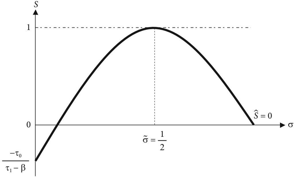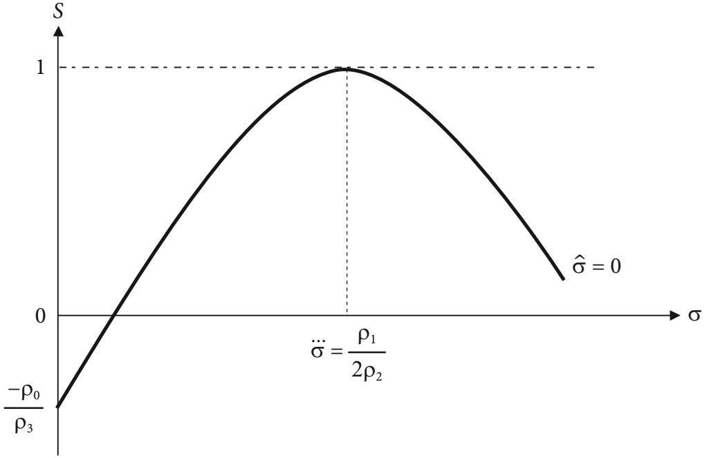 The locus σ (with circumflex) has a negative intercept and describes a parabola with the concavity facing downward. Furthermore, it has two real roots, but only one of them assumes values between zero and one. Moreover, there is a maximum point (see Figure 3).