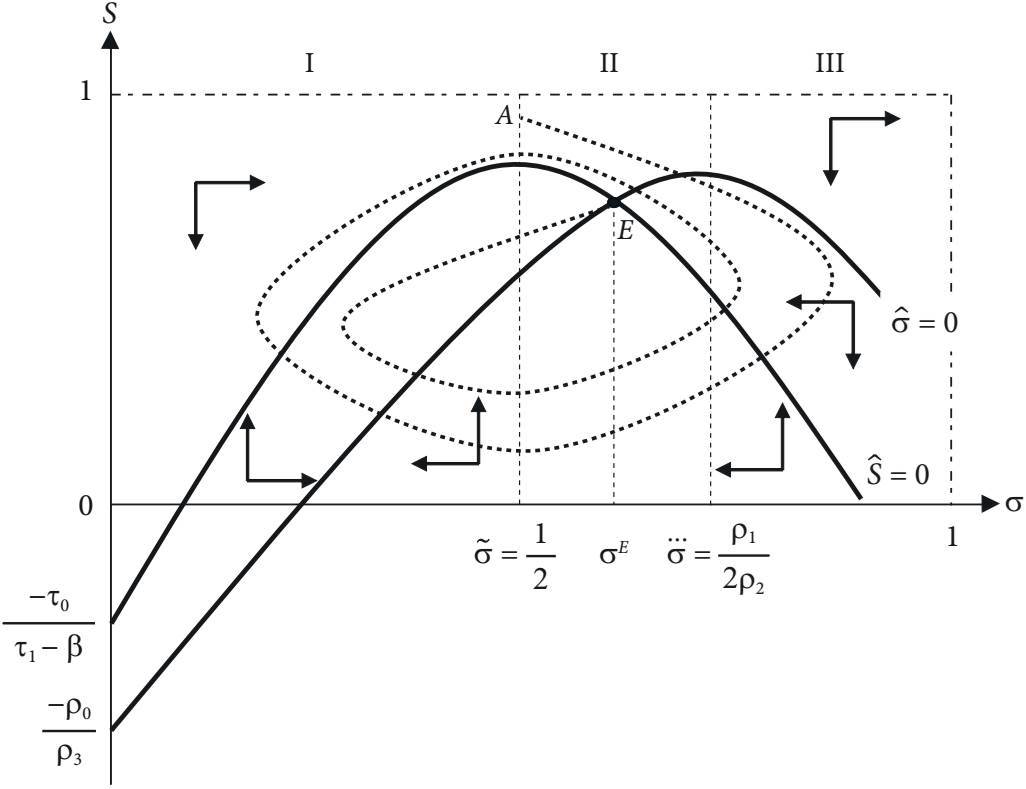 It is worth mentioning that the assumption that the sensitivity of technological progress in the North with respect to the technological gap is greater than its equivalent for the economy of the South, that is, τ1 > β, is fundamental both to determine the slope of the locus Ŝ = 0 regarding the conditions for the existence of one or more equilibria as well as the stability of the system.