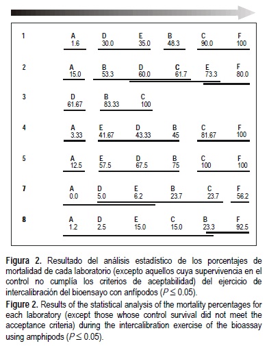 Además se estudió el efecto de esta variabilidad en la clasificación de las muestras según los resultados del ensayo en cada laboratorio individualmente. El porcentaje de mortalidad se normalizó mediante transformación angular y fue tratado como una distribución normal para posteriormente buscar diferencias entre el control negativo de toxicidad (sedimento A) y cada una de las muestras. Las muestras significativamente homogéneas (P ≤ 0.05) fueron identificadas mediante un test ANOVA y test de Tukey mediante el programa estadístico SPSS 11.0.