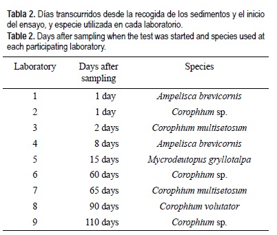 En total se recogieron datos de nueve laboratorios participantes. Los laboratorios (identificados del 1 al 9), las fechas de ensayo y las especies utilizadas por cada uno de ellos se presentan en la tabla 2. Se encontraron diferencias importantes en el tiempo de almacenaje de las muestras de sedimento previamente al inicio del ensayo, muy por encima de los tiempos recomendados que son de tres a cuatro semanas (USEPA 1994), sin embargo, por diversas razones este tiempo varió desde las tres semanas hasta tres meses para algunos laboratorios. Los resultados de mortalidad media y la desviación estándar se presentan en la figura 1, en la que se aprecia la disminución de la toxicidad registrada por los laboratorios 7, 8 y 9 para todas las muestras excepto la F. Todos los laboratorios excepto el 6 y el 9 alcanzaron los valores mínimos de supervivencia en el sedimento control para la aceptabilidad del ensayo (90%). Por ello los resultados de los laboratorios 6 y 9 no fueron considerados para el cálculo de los parámetros estadísticos. Los parámetros de calidad del agua (concentración de oxígeno disuelto, pH, salinidad, temperatura y amonio total) estuvieron en el rango permitido para las especies.
