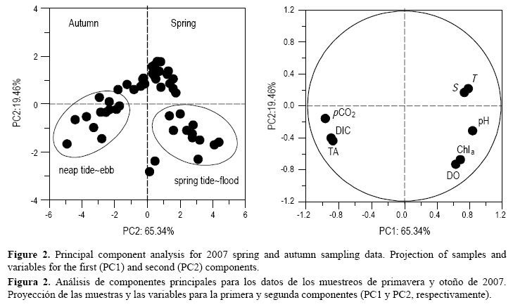 Los resultados del PCA explican de qué manera la variabilidad de los parámetros del sistema del CO2 estudiados (pH, pCO2, TA, DIC) se asocia con las variables ambientales (S, T, DO, Chl a). En la figura 2 se muestran las proyecciones de las muestras y las variables para las dos componentes principales y se nota como todas las variables se encuentran bien separadas en el primer plano. La primera componente (PC1) es una combinación lineal de todas las variables que discrimina el agua de mar con altos niveles de salinidad, pH, DO y Chl a, y bajos pCO2, TA y DIC del agua estuarina con propiedades opuestas. La segunda componente, PC2, discrimina el agua de mar con alta salinidad y temperatura. Estas primeras dos componentes representan 85% de la varianza total de los datos. La proyección de las muestras en el plano revela que los datos obtenidos en primavera durante las mareas vivas (en su mayoria en condiciones de flujo) y los obtenidos en otoño durante las mareas muertas (principalmente en condiciones de reflujo) están bien separados. También se nota que las otras muestras se proyectan más hacia el cruce de los ejes, lo que indica una influencia mezclada de ambas masas de agua en las fases intermedias de marea en ambas estaciones.