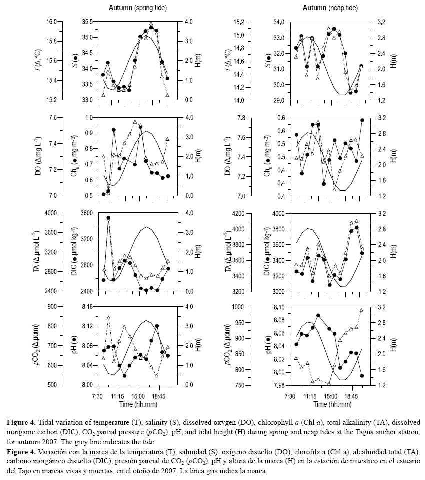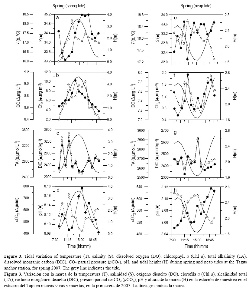 Durante las mareas vivas la salinidad de las muestras sigue de cerca el transporte debido a las mareas, con valores máximos y mínimos que coinciden con la marea alta y baja, respectivamente (figs. 3a, 4a). Los otros parámetros también siguen el transporte por las mareas, observándose simultáneamente los mayores valores de T, DO, Chl a y pH y los mínimos de TA en marea alta (figs. 3, 4). En contraste, durante las mareas muertas se encontró un desfase entre los máximos de salinidad y la máxima pleamar (figs. 3e, 4e). Tal comportamiento también se reflejó en la distribución de T, DO, Chl a, pH y TA (figs. 3, 4). Estos patrones se debieron al comportamiento asimétrico de la marea en el estuario del Tajo, sistema en el que los flujos de marea son típicamente una hora más largos que los reflujos (Fortunato et al. 1999), dando lugar a mayores velocidades durante el reflujo. En ambos periodos de muestreo los valores de pCO2 también siguieron el ciclo de marea alcanzando menores valores durante la pleamar. Por ello, las gráficas de los parámetros a lo largo de las 13 h de muestreo (figs. 3, 4) conducen a las mismas conclusiones que el PCA; es decir, durante la pleamar (principalmente durante el flujo) agua oceánica más salada y caliente con mayores niveles de pH y Chl a domina en la parte baja del estuario, mientras que durante la bajamar (principalmente durante el reflujo), aguas más frías con menos Chl a y altos niveles de TA y pCO2 de las partes central y alta del estuario es transportada mar adentro .