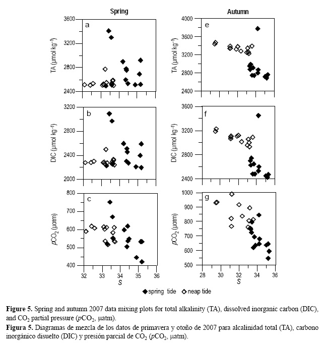 Las gráficas del diagrama de mezcla (fig. 5) refuerzan las conclusiones anteriores y también muestran, con base en las distribuciones de los parámetros del CO2, la mezcla de las masas de agua estuarina y oceánica. Un trabajo previo en el estuario del Tajo, (AP Oliveira no publicado) mostró la influencia de la mezcla y el transporte en la variabilidad de la pCO2 debida a las mareas solamente en el otoño. En el presente estudio se evaluó el efecto de los procesos de mezcla en la variabilidad debida a las mareas de los parámetros del sistema del CO2 mediante regresiones lineales. Estos procesos fueron responsables del 50-70% de la variabilidad (P < 0.05). Por lo tanto, otros mecanismos deben ser parcialmente responsables por la demás varibilidad.