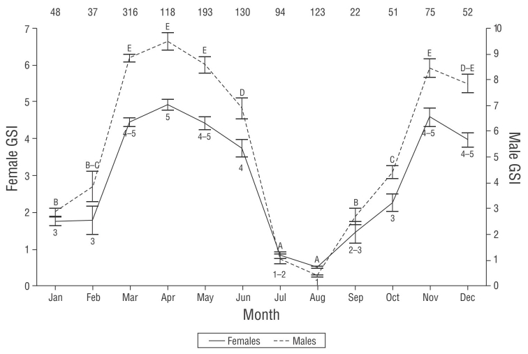 El valor medio total del IGS para los machos fue más alto que el valor para las hembras (F 1, 1,254 = 374.88, P < 0.001). Los valores medios más altos ocurrieron de marzo a junio y de noviembre a diciembre, y difirieron de manera significativa con respecto al resto de los meses tanto para las hembras (F 11, 631 = 82.27, P < 0.001) como para los machos (F 11, 604 = 93.24, P < 0.001). En las comparaciones por pares, se identificaron 5 grupos en ambos sexos y se distinguieron 2 tendencias, medias con valores bajos (hembras 1, 2, 3; y machos A, B, C) y valores altos (hembras 4, 5; y machos D, E) (Fig. 3). La variación del IGS para hembras y machos siguió una tendencia semejante, la cual indicó correlación alta (r s = 0.97, P < 0.001, n = 12).