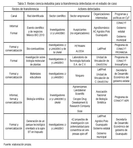 Esta subsección presenta el análisis de seis redes de transferencia identificadas en el trabajo de campo. La tabla 3 muestra las redes identificadas. Para el trabajo fueron consultados trece informantes calificados integrantes del sector académico (investigadores y representantes de la Oficina de Vinculación del CINVESTAV), empresarial, gubernamental (gobierno de Guanajuato) e intermediario (organización de servicios de negocios intensivos en conocimiento especializada en transferencia tecnológica).