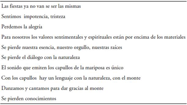 El Cuadro 7 es revelador del significado social y cultural que esta mariposa tiene en el pensamiento de los mayo. Refleja con claridad la lucha de un pueblo por permanecer y el valor que tiene el binomio biocultural mariposas/ fiestas. Cuando se les preguntó ¿Qué sentirían si desaparece la mariposa Cuatro Espejos? expresaron: