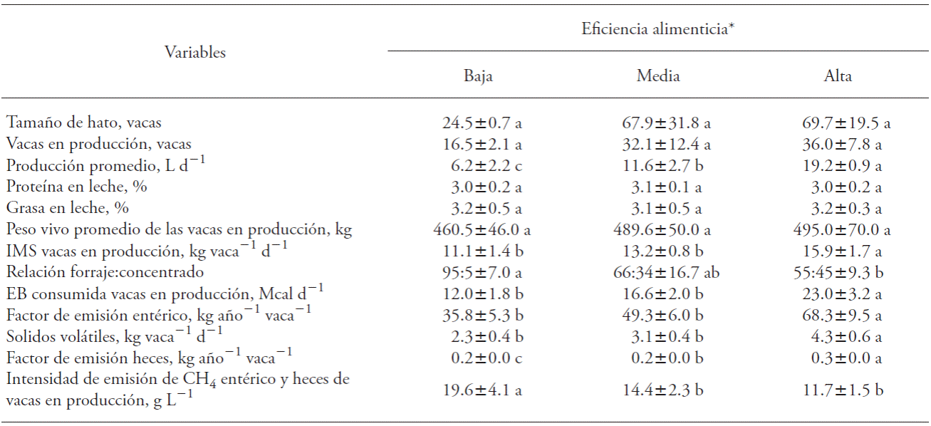 The cluster analysis defined three groups (Table 3). Among these groups, there were no significant differences in herd size, milking cows, live weight or protein and fat content in milk. For the low feed efficiency cows (Table 3), milk production was lower (6.25±2.19 L) and CH4 emission intensity was higher (19-59±4.10 g L -1). In these systems, milking is done with portable equipment and family labor. Feed production area is small (1.5±2.12 ha), diet is a 95:5 forage:concentrate ratio. Forage consists of fresh alfalfa (Medicago sativa), maguey (Agave salmiana) and sorghum (Sorghum bicolor L.), and the concentrate is a mixture of 40 % poultry manure, 20 % maize grain, 20 % bran and 20 % commercial concentrate.