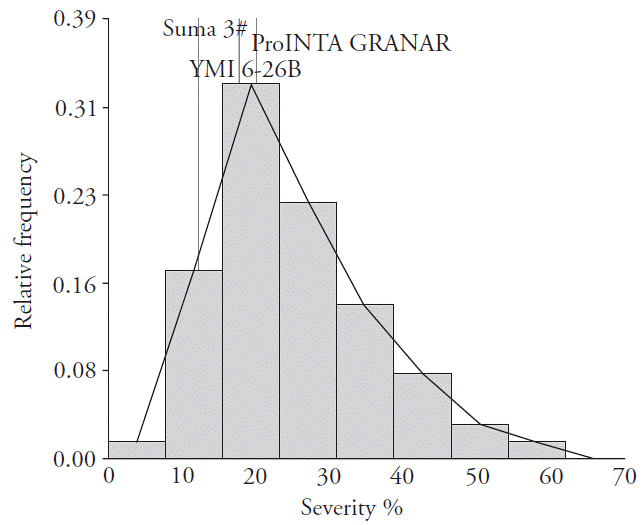 Figure 1 Frequency histogram of the Argentine cultivars infected with Fusarium graminearum. The bars illustrate the degree of severity as a percent on the abscissa versus the relative frequency of the cultivars that belonged to the corresponding degree of severity plotted as a fraction on the ordinate. The respective severity-versus-frequency values of the control cultivars Sumai 3, YMI 6-26B, and ProINTA Granar, shown above the bars, is indicated by vertical lines demarcating their position within the scheme.