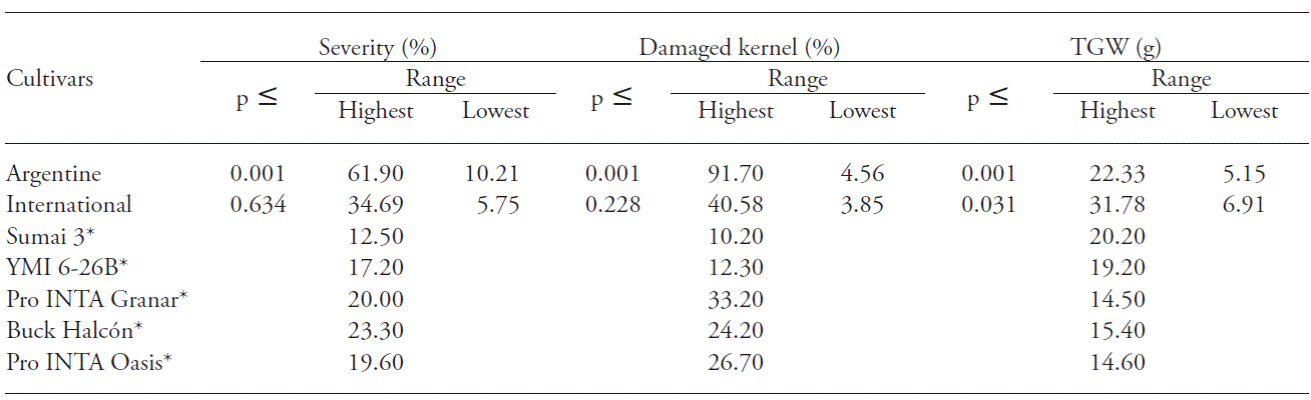 The pathogenicity on the Argentine cultivars showed statistically significant differences in all the variables analyzed, except for incidence, whereas in the international cultivars significant differences were observed only for TGW (Table 1). Cowger et al. (2009) found significant differences for variables incidence, severity, percentage of damaged kernels, and deoxynivalenol content among winter-wheat cultivars.