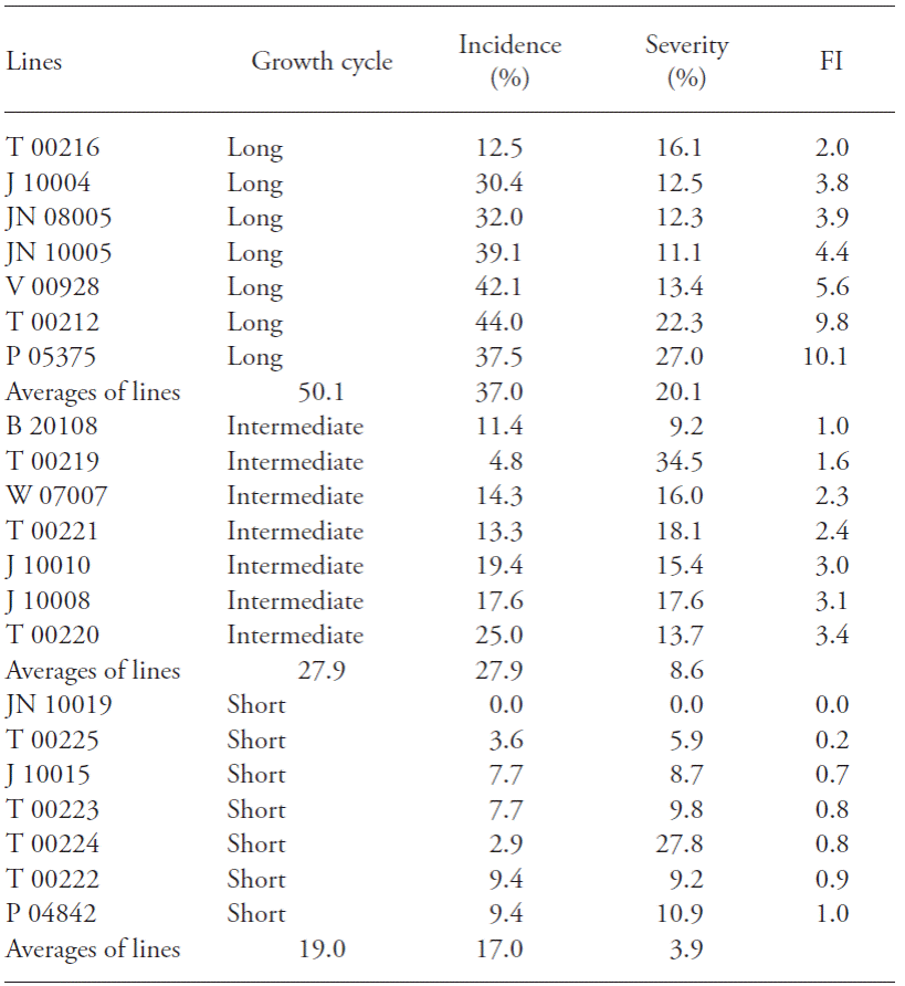 A study of the advanced wheat lines having different growth cycles obtained from the INTA breeding program was also useful in the search for genotypes resistant to FHB. Disease progression was registered according to the Fusarium index integrating the values of incidence, severity, and the combination of the two, expressed as (incidence X severity)/100 (Hernandez, 2010), and the lines with low values of the Fusarium index were considered resistant. The highest level of Fusarium index values were for the long-growth-cycle lines and the lowest level for the short-growth-cycle lines, whereas the values for the lines of intermediate growth fell somewhere in between. Despite certain degree of overlap between the adjacent groups, the average values of the three groups showed a clear-cut difference among the responses of those three categories of growth-cycle kinetics. All the lines showed infection levels (severity) below 20 %, except Т 00212, р 05375 (long growth cycle), Т 00219 (medium growth cycle) and Т 00224 (short growth cycle). The lines with higher resistance to FTB infection, and severity levels below 30% were characterized as moderately resistant (Table 4). According to Jin et al. (2013), for 363 lines from the USA, 43 % were susceptible, 32 % moderately susceptible, and 7-0 % resistant.