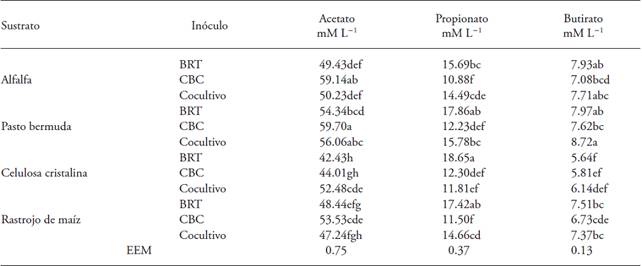 CBA produced more acetate (p≤0.05) than TRB when fermenting with alfalfa and Bermuda grass (Table 1), due to the action of the cellulolytic bacteria, which are fermenters of acetate (Zhang et al., 2015). However, CBC and TRB in crystalline cellulose and maize stalks were not different (p>0.05) since the products of in vitro fermentation depend on the type of inoculum and the type of substrate (Weimer et al., 2011).