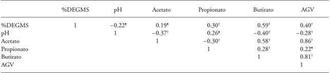 pH correlated negatively with total VFA and acetate (Table 3). When VFA production increased, pH became acid. This agrees with Relling and Mattioli (2003) in that, because of its acid feature, the higher the production of VFA, the lower the ruminal pH. Total VFA production correlated positively with %DMDEG, thus, when total VFA production increased, %DMDEG also increased. These results agree with Getachew et al. (2004), who point out that the correlation between in vitro degradation and VFA production is positive. Production of acetate increases when that of propionate decreases, based on the negative correlation of these variables (Table 3). This is due to the type of microorganisms present during fermentation of cellulosic substrates (Anrique, 2010).