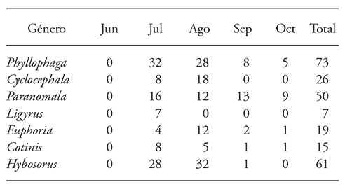 Table 3 Melolonthidae, Cetoniidae, and Hyborosidae species harvested with a fluorescent black light trap in sesame (Sesamum indicum L.) crops, in Ocolome, El Fuerte, Sinaloa, México.