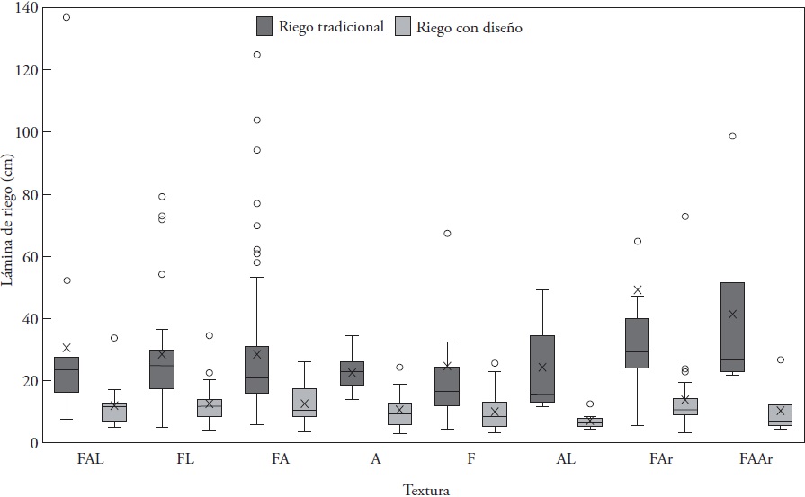 In all the textural classes there was a considerable reduction in the number of furrows per length (Figure 5). In the most critical case, it went from 105 to 39 furrows per length, since in that plot to irrigate 1 ha the entry flow rate was 38.85 L s-1 for 57.3 h. After the recommendation, the time was reduced to 12.97 h, which was equivalent to using in the traditional case a volume of 7 972.02 m3 and with the recommendation, 1 814.4 m3; the savings was 6 157.62 m3 ha-1 in each irrigation event.