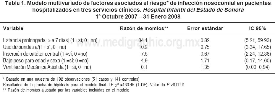 Las cinco variables que mostraron significancia estadística en el análisis bivariado fueron examinadas mediante regresión logística multivariada. En ésta, se apreció que las únicas variables que mantuvieron su significancia fueron la estancia prolongada ≥ 7 días, que incluso duplicó su peso al registrar una RM =34.1, IC95% (5.21, 59.93); el uso de sondas se mantuvo prácticamente igual, RM =10.2, IC95% (3.34, 17.65) y la inserción de catéter central que se incrementó a una RM =7.5, IC95% (2.24, 12.36). El modelo global mostró ser estadísticamente significativo (χ2 = 133.45, valor de P <0.0001) (Tabla 1).