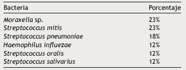 Todos los aislados bacterianos fueron cultivos puros. Moraxella sp. y Streptococcus mitis fueron los agentes bacterianos predominantes, y se aislaron en el 23% ambos. Después siguió Streptococcus pneumoniae, contando para el 18% de los casos (Tabla 2). Desafortunadamente, la identificación de M. catarrhalis por el sistema VITEK® no fue satisfactoria, ya que no se pudo identificar de manera precisa sino únicamente como Moraxella sp.