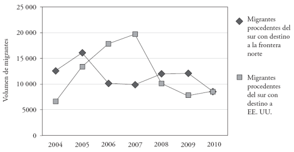 According to data from the Border Migration Survey (Encuesta sobre Migración en la Frontera, EMIF), with the information reserves provided by migrants at the time of the survey, migrants from Nayarit have as their main destination the Northern Border on the Mexican side, although in 2006, 2007 and 2010 the tendency was reversed to the degree of finding more Nayarit residents who were going mainly to the United States (Figure 1).