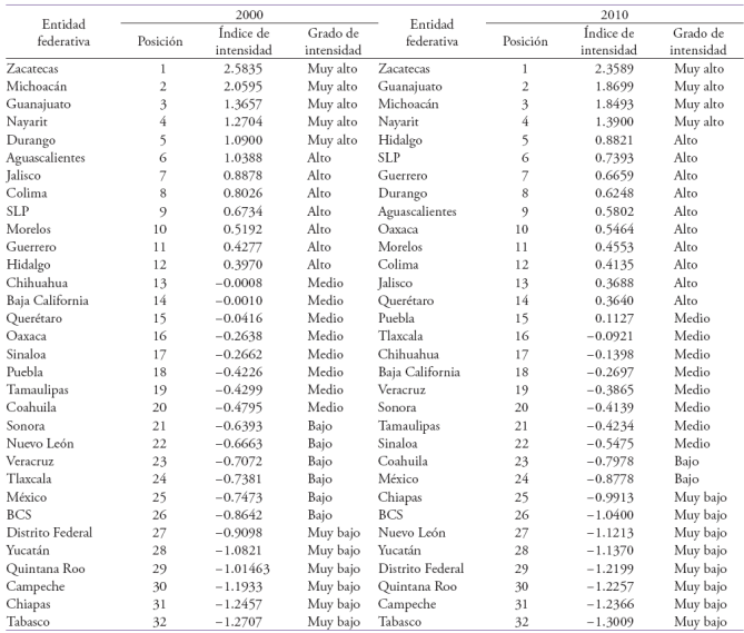 Table 1 México-United States migration according to the index and degree of migratory intensity (2000-2010).