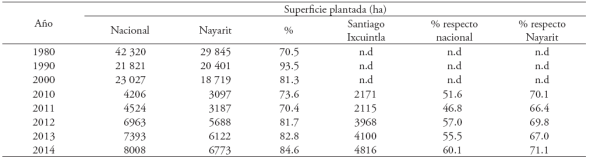Located on the northern coast of the state of Nayarit, according to data from INEGI, for 2010 the municipality Santiago Ixcuintla, previously known as “La Costa de Oro” records a total population of 93 074 inhabitants. It is a municipality that is historically invigorated by the agricultural sector, it has a total of 66 369 hectares devoted to agricultural activities, standing out at the state and national level in production of fruit trees and basic grains, among them maize, but primarily tobacco, with 70 % of the state tobacco production and approximately 60 % of the national production (Table 2).