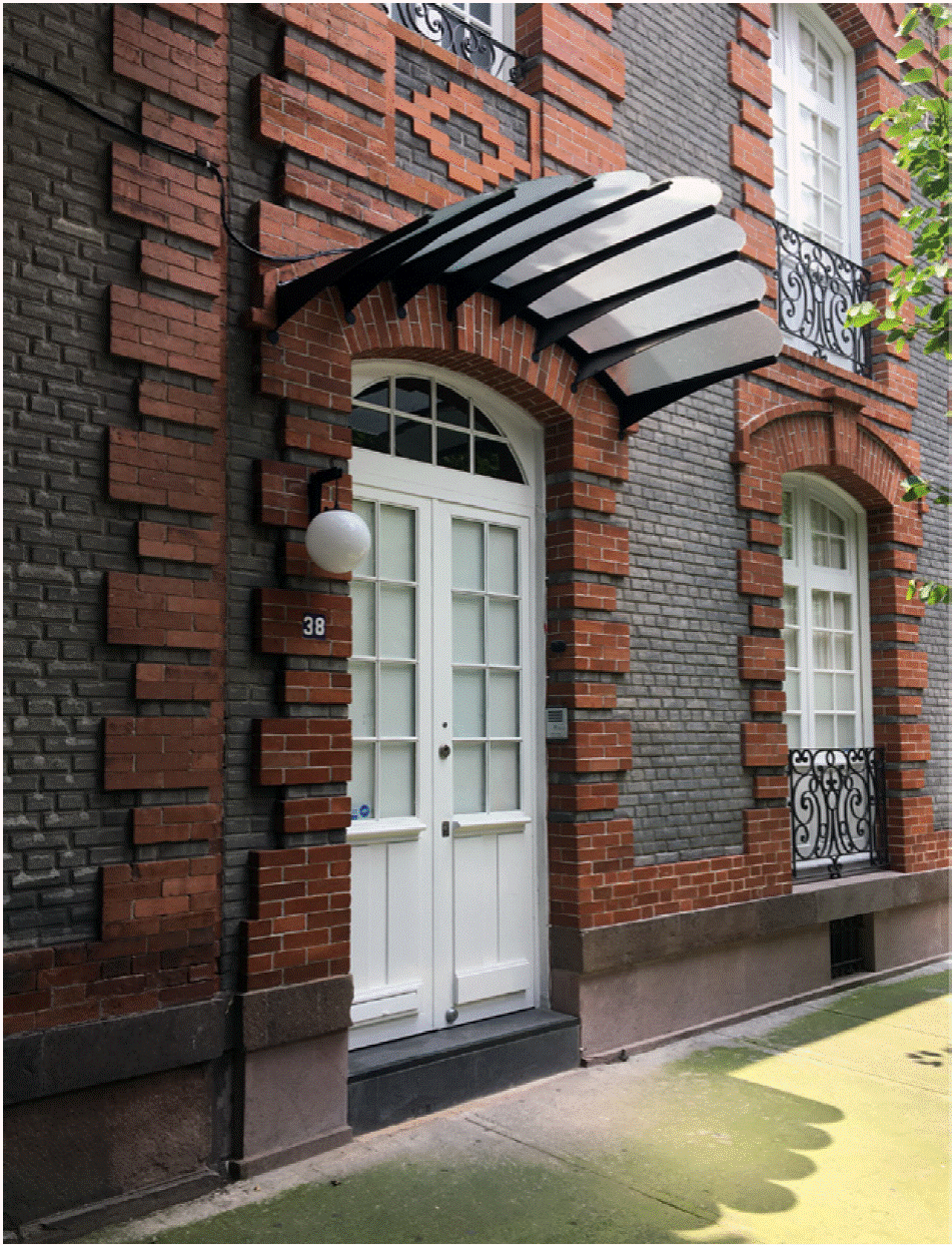Figure 1 Facade in exposed brick in the house Pomona No. 38, Roma Norte, Mexico City. The use of two types of brick in a polychromatic composition is observed, Huerta brand industrialized red brick (22 x 10 x 6 cm) and cement brick (20 x 10 x 6 cm) smooth with bevel. Work attributed to architect Manuel Cortina García.
