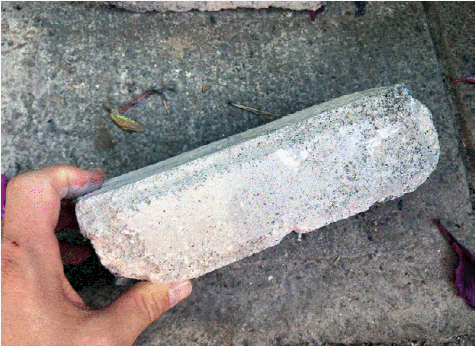 Figure 3 Sample of a cement partition wall (20 x 10 x 6 cm) smooth and with bevel, extracted in 2020 from the facade of the house located at Pomona No. 38, col. Roma Norte.
