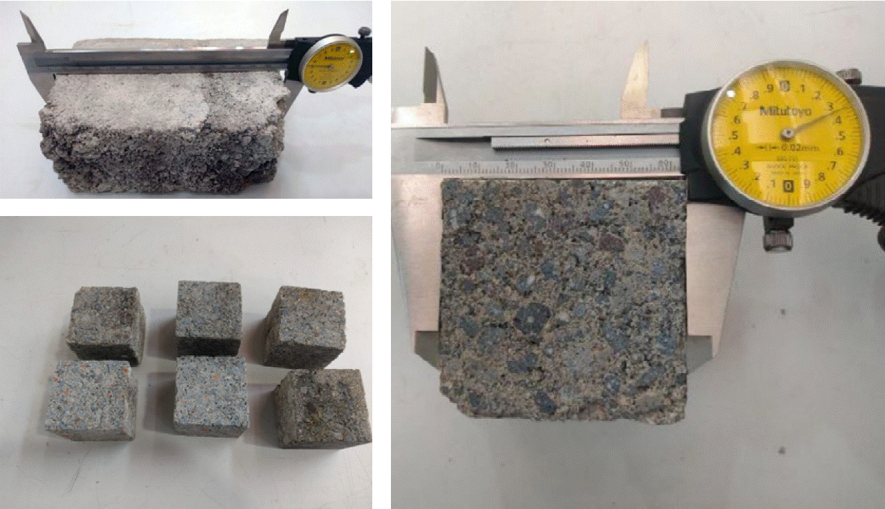 The pieces called cement brick are made with mortar, and in order to know their physical mechanical properties today (2023) and, therefore, to observe if mortar strength is preserved based on the current regulations, pieces were extracted from the building lo cated at 38 Pomona Street in the Roma Norte neighborhood, in the Cuauhtémoc district of Mexico City, which had an average size of 6.45 x 10.32 x 15.05 cm.14 It was decided to extract at least six of them, to test them under simple compression, selecting those with a more uniform geometry. These pieces were prepared for compression testing according to the parameters established by Mexican Standard NMX-C-038-ONNCCE-2013 (Norma Mexicana, 2013), and because of the cubic geometry of the specimen, three measurements of length, width and height were taken for each piece, to average the values obtained (Figure 4).