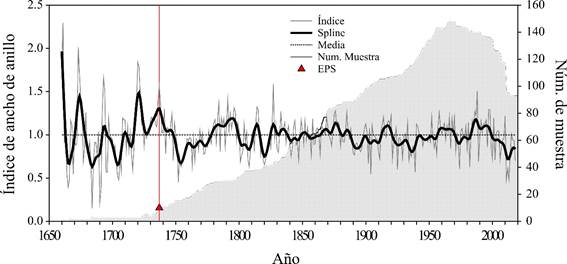 Figura 2 Cronología compuesta de anillo total de Pseudotsuga menziesii, Pinus arizonica y Pinus strobiformis. La serie de tiempo muestra la variabilidad climática en los últimos 359 años para la región oeste de Chihuahua. La línea de color gris de fondo representa la variabilidad anual; la línea horizontal punteada, la media; la línea resaltada en color negro es un spline de 10 años que permite la observación de eventos de baja frecuencia; y el área gris indica el tamaño de muestra para cada segmento de la cronología regional. La línea en color rojo representa un valor de la señal expresada de la población (EPS) > 0.85.