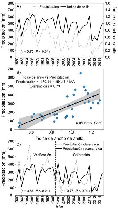 La Figura 4A muestra asociación altamente significativa (r = 0.73, P< 0.01) entre el periodo de lluvia estacional octubre-junio y el índice de ancho de anillo total para el periodo común 1980-2015. Se generó un modelo de regresión lineal que permitió reconstruir la variabilidad de la precipitación de datos observados en dicho periodo (Figura 4B). El modelo fue el siguiente: