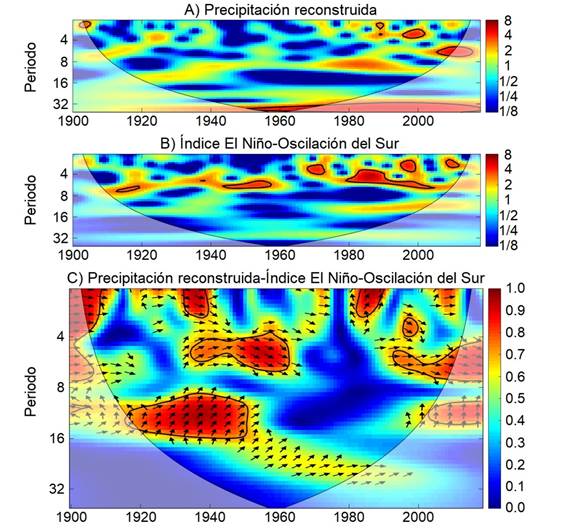Figura 8 Espectro de ondeleta para la precipitación reconstruida (A) y el índice ENSO 3.4 (B). Análisis de coherencia de ondeletas entre la serie de precipitación reconstruida y el índice ENSO 3.4 (C). Las áreas en color rojo delimitadas por una línea negra indican una relación significativa (P< 0.05) entre las dos variables. Las flechas horizontales hacia la derecha indican que ambos fenómenos están en fase (relación positiva). Por el contrario, las flechas hacia la izquierda señalan una relación en antifase o relación negativa.