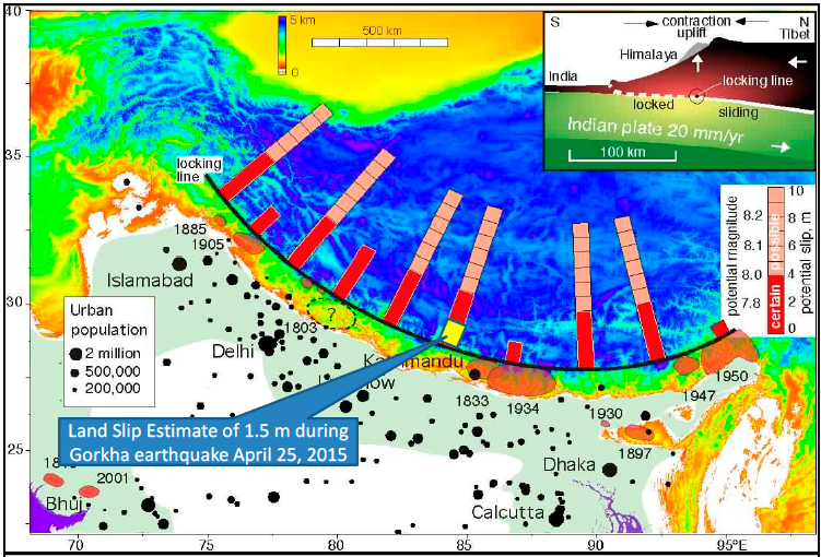 O Sr. Jean Ampuero, do Instituto de Tecnologia da Califórnia, em seu artigo "Características Sobresalientes do Terremoto de 2015 em Gorkha, Nepal em Relação ao Ciclo do Terremoto e Modelos de Ruptura Dinâmica" indica que os movimentos terrestres de alta frequência produzidos em Katmandu pelo terremoto Gorkha foram mais fracos do que os esperados por tal magnitude. O deslizamento estático chegou perto de Kathmandu, mas teve um tempo de ascensão longo. Uma observação importante (Katsuichiro Goda, Departamento de Engenharia Civil, Universidade de Bristol, Bristol, UK et al.) é que o movimento do solo agitado em Katmandu durante o terremoto principal de 2015 foi menor do que as estimativas PGA (com 10% de probabilidade de exceder em 50 Anos, ou seja, um período de retorno de 475 anos). Isto pode indicar que a intensidade de movimento no solo experimentada em Katmandu não foi tão intensa, em comparação com os preditos a partir de estudos probabilísticos de risco sísmico para o Nepal. Portanto, é necessária uma cautela em relação a futuros terremotos no Nepal, porque o terremoto de 2015 não é necessariamente o pior cenário possível e podem ocorrer terremotos mais intensos. As medições de deformação superficial, incluindo os dados do Radar de Abertura Sintética Interferométrica (InSAR) adquiridos pela missão ALOS-2 da Agência Japonesa de Exploração Aeroespacial (JAXA) e dados do Sistema de Posicionamento Global (GPS) foram invertidos para a geometria de falhas e a distribuição sísmica do Terremoto de Gorkha Mw 7.8 no Nepal. A ruptura do terremoto de Gorkha em 2015 foi dominada por um movimento de impulso que se concentrou principalmente em uma zona de 150 km de extensão, de 50 a 100 km a norte do traço de superfície do Foco Frontal Principal (MFT), com deslizamento máximo de ~5,8 m a profundidade de ~ 8 km, e 1,5 m na superfície em Kathmandu Valley. Em 1988, Roger Bilham estimou que este deslizamento seria de magnitude de pelo menos 10 m (Figura 1). Assim, com base nos valores observados de deslizamento máximo de terra e na aceleração de solo máxima provável (PGA), o Terremoto de Abril poderia ser denominado como uma grande prova para futuros terremotos maiores no Nepal.